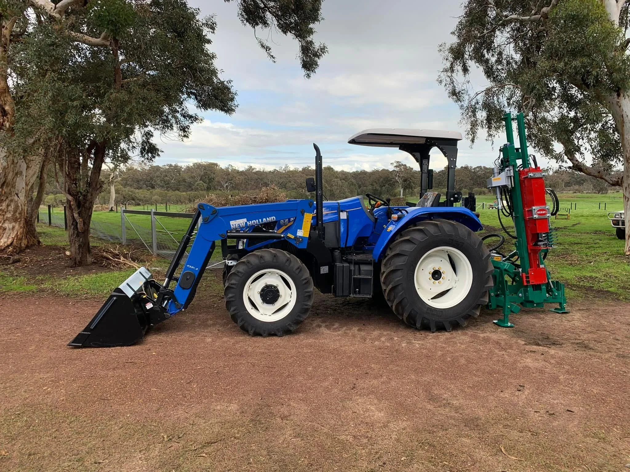 Blue New Holland tractor with front loader and post driver attachment on a farm.